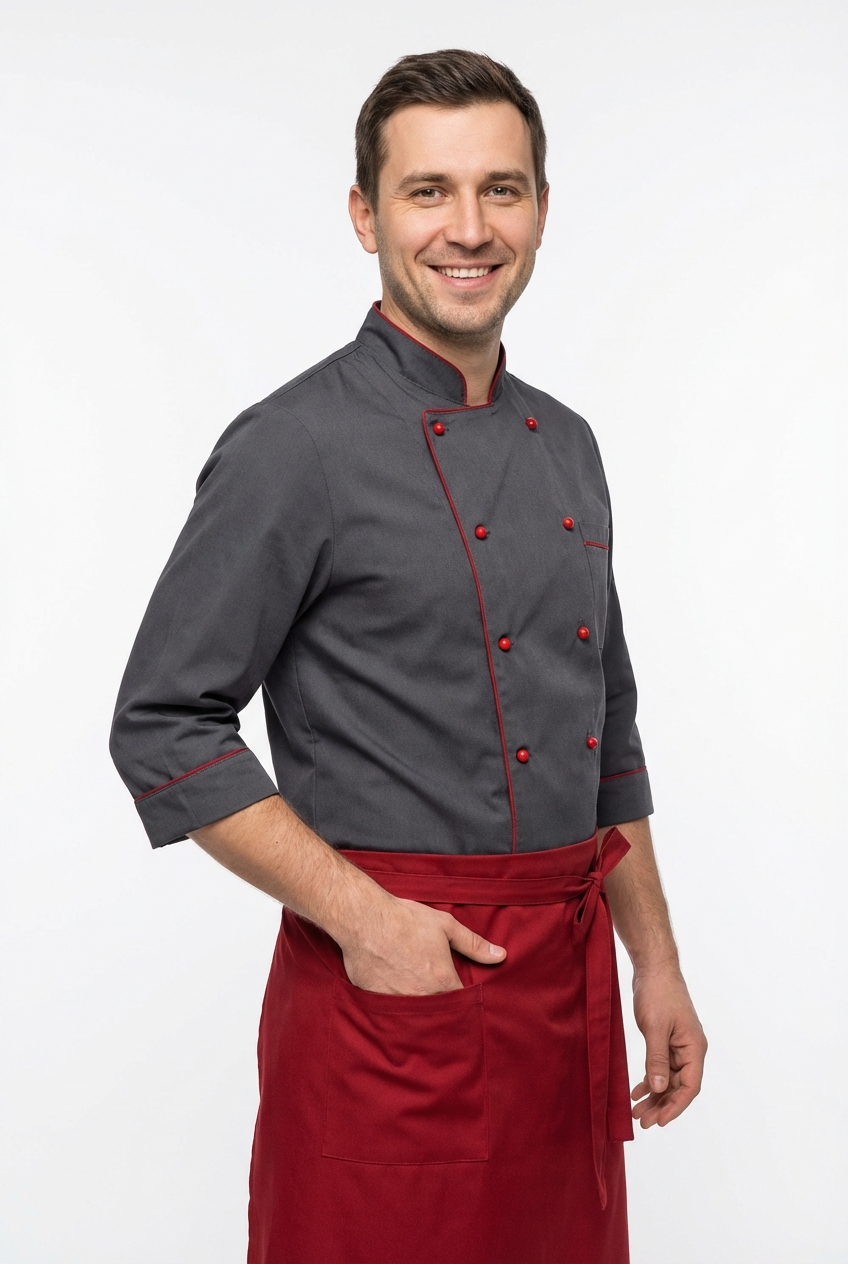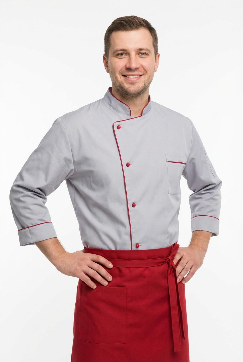 Серый мужской поварской китель с красной отделкой: красные пуговицы, красная окантовка воротника, манжет и карманов. Рукав 3/4, красный фартук. Яркий акцент и удобный крой для профессиональной кухни.