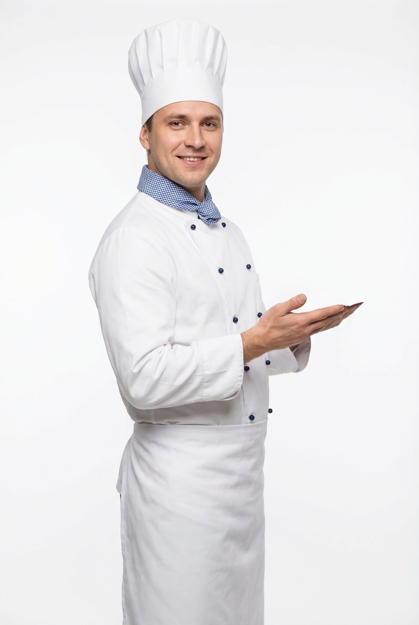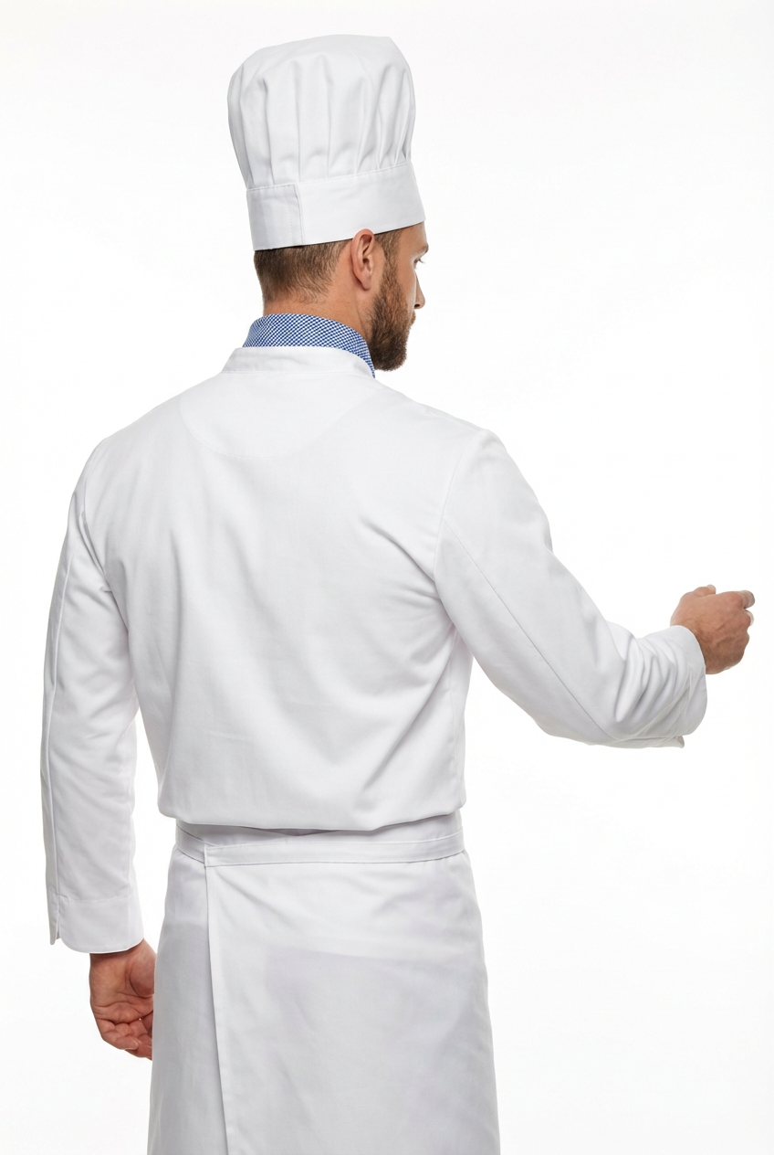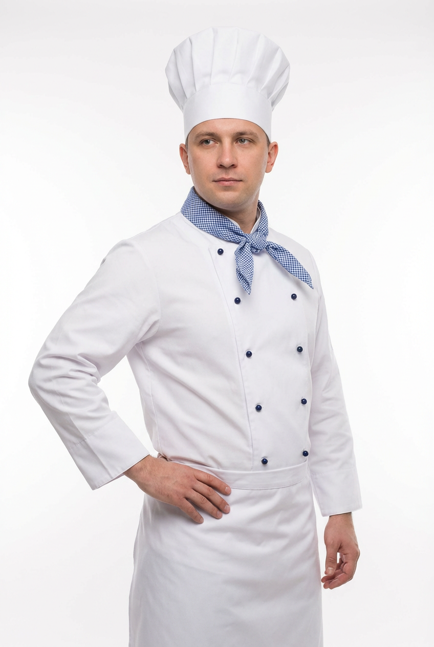 Классический белый мужской поварской китель двубортного кроя с тёмно-синими пуговицами и сине-белым шейным платком. Длинный рукав, высокий белый колпак в комплекте. Традиционный профессиональный образ шеф-повара.