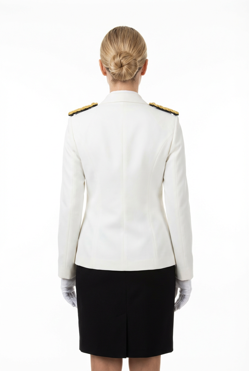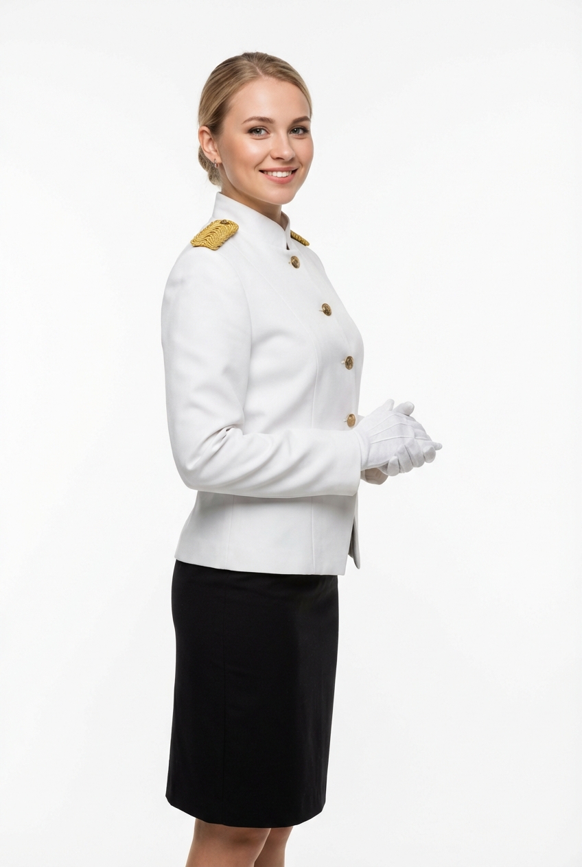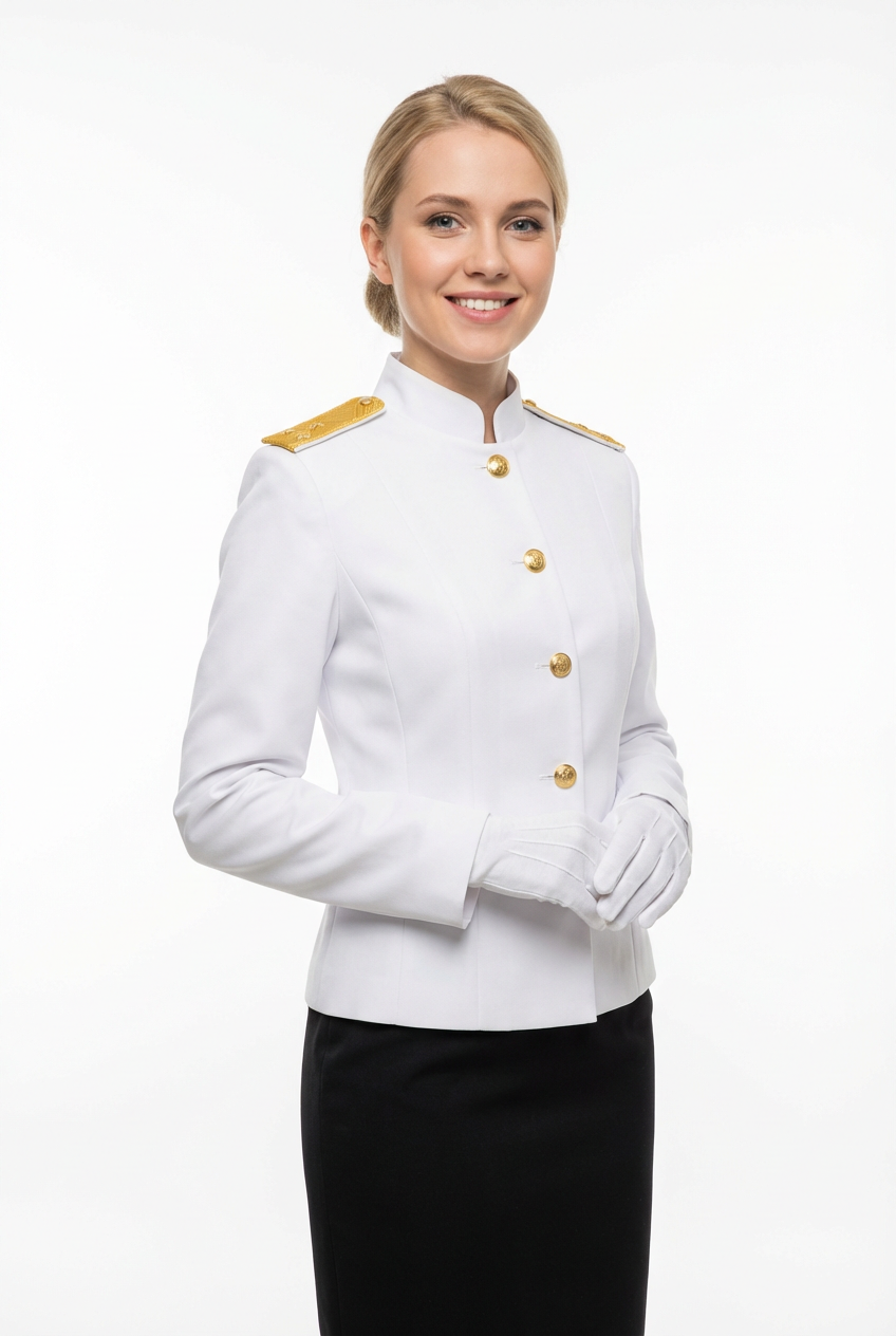 Женский банкетный китель с золотыми эполетами и золотыми пуговицами. Классический белый с золотыми элементами — воплощение элегантности для официанток и администраторов. Однобортный крой, воротник-стойка, белые перчатки в комплекте.