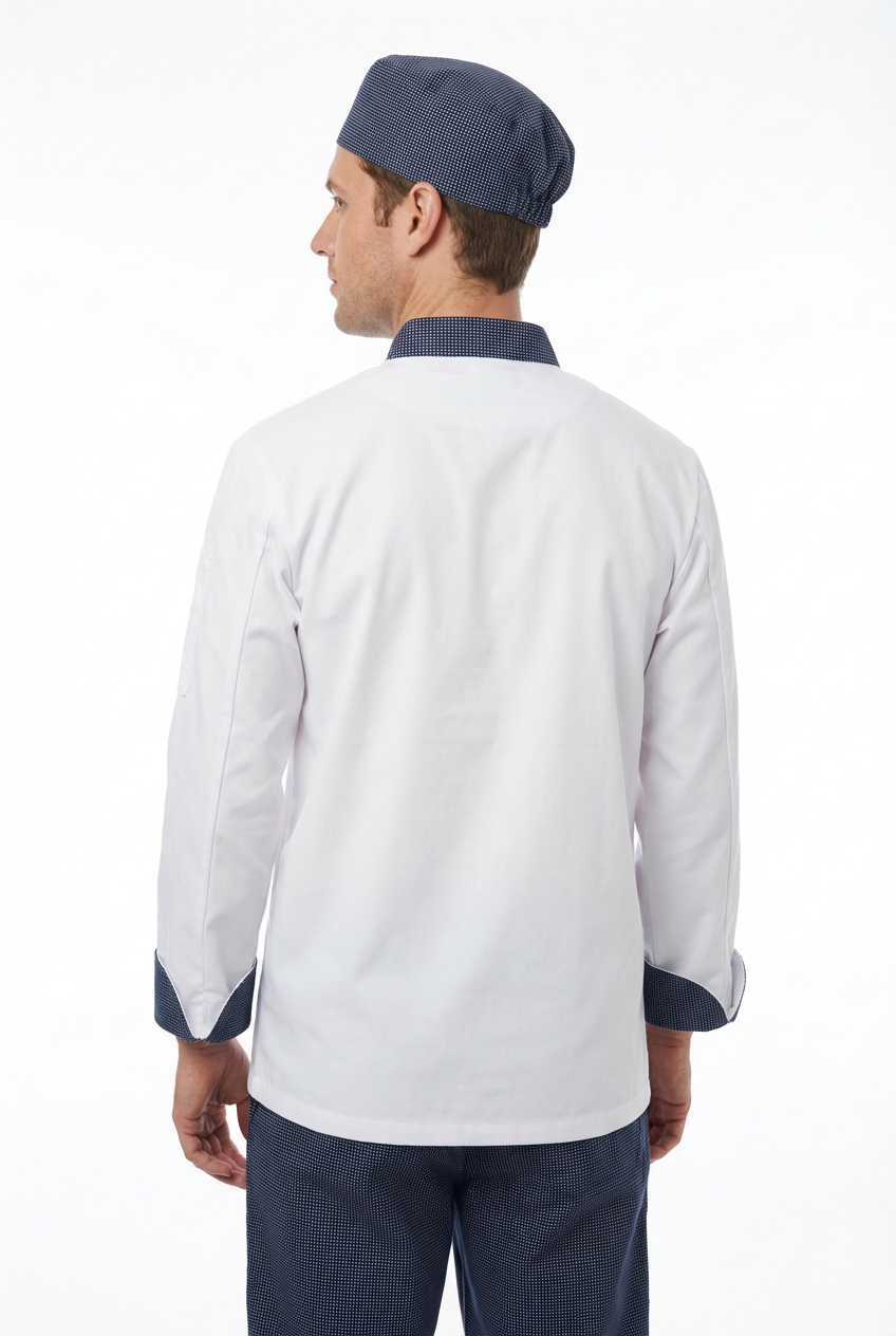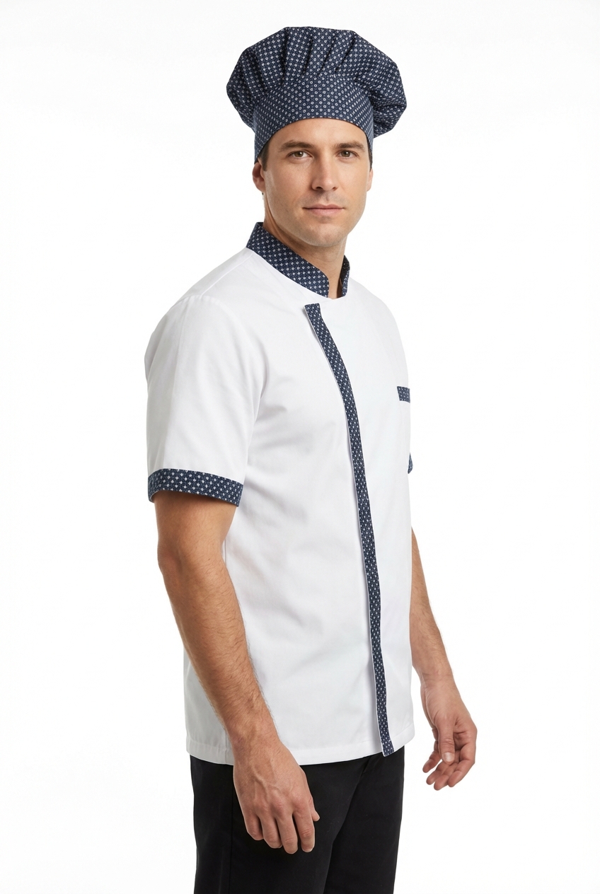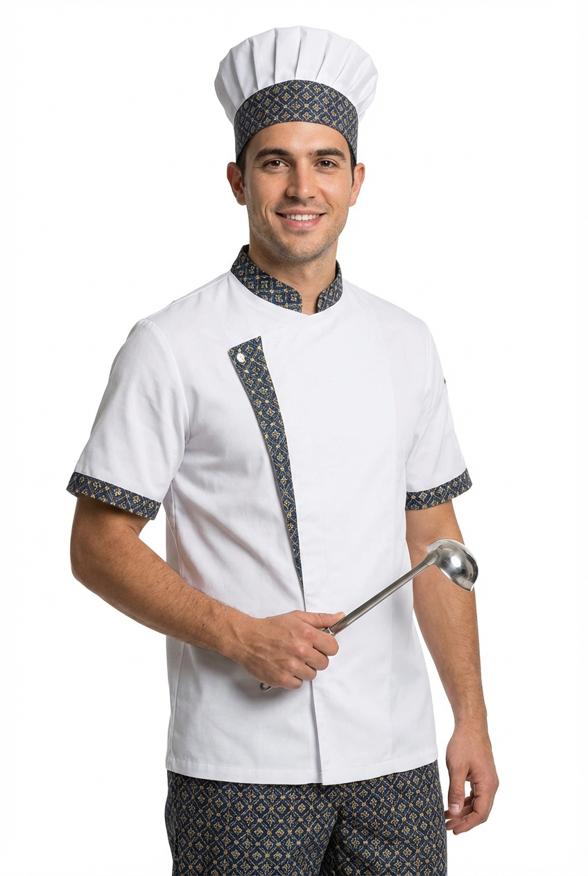 Мужской поварской китель с декоративной тёмной окантовкой на воротнике и манжетах. Укороченный рукав, лёгкая белая ткань. Орнаментальная отделка придаёт национальный колорит. Подходит для поваров восточной и азиатской кухни.