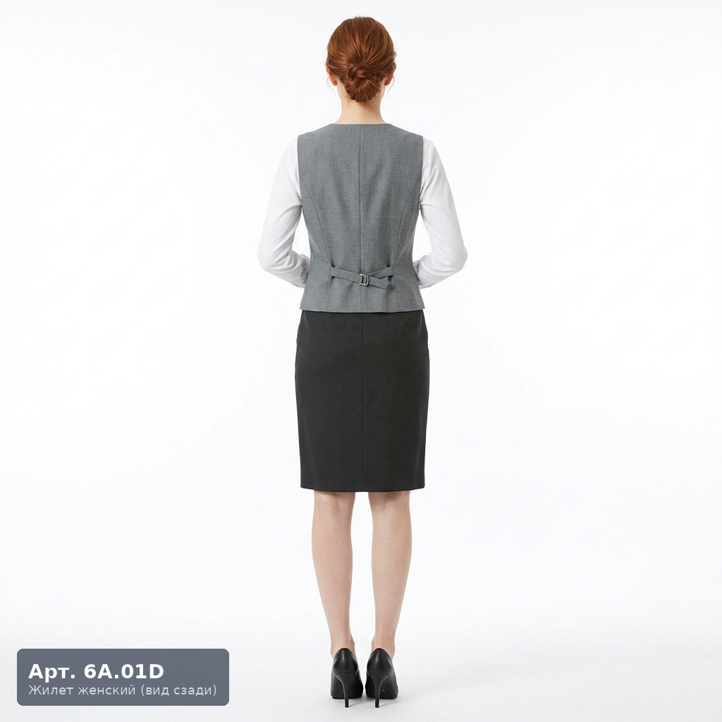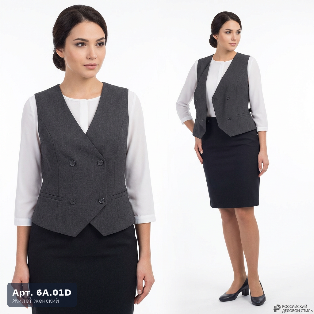 Женский форменный жилет 6А.01Д — двубортная версия популярной модели 6А.01. Строгий деловой силуэт делает эту модель отличным выбором для офисного и банковского персонала, сотрудников административных структур. Двубортная застёжка на четыре пуговицы придаёт образу официальности и респектабельности. V-образный вырез, боковые прорезные карманы, фигурная линия низа. Рекомендуется для: сотрудников банков и финансовых организаций, администраторов бизнес-центров, персонала представительских офисов. Отшивается по размерному ряду 42–54, возможна корректировка под нестандартные фигуры.