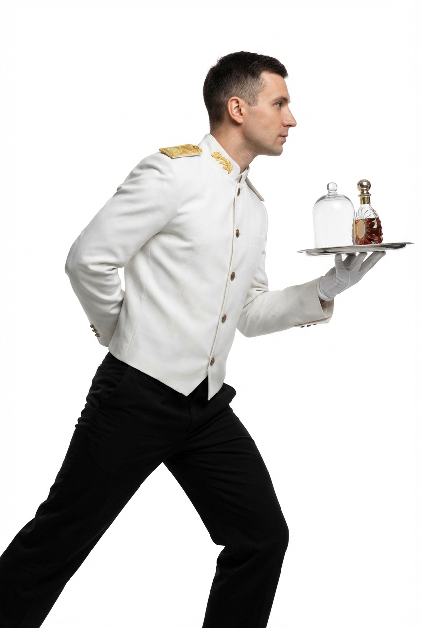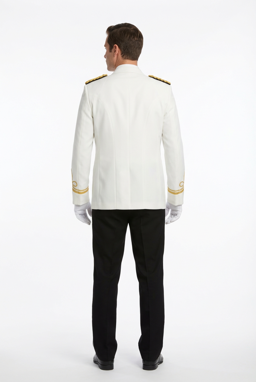 Торжественный мужской банкетный китель с золотыми эполетами и золотой отделкой на манжетах и воротнике. Однобортный крой с четырьмя золотыми пуговицами, приталенный силуэт. Для банкетных официантов и метрдотелей высокого класса.