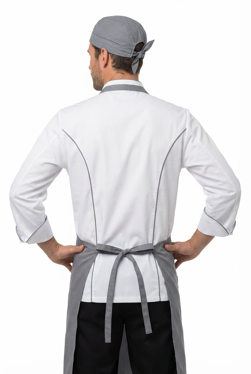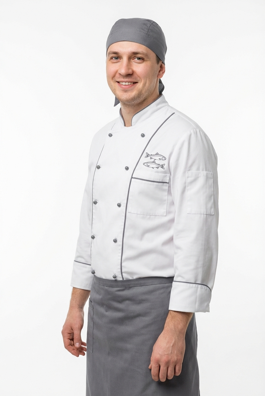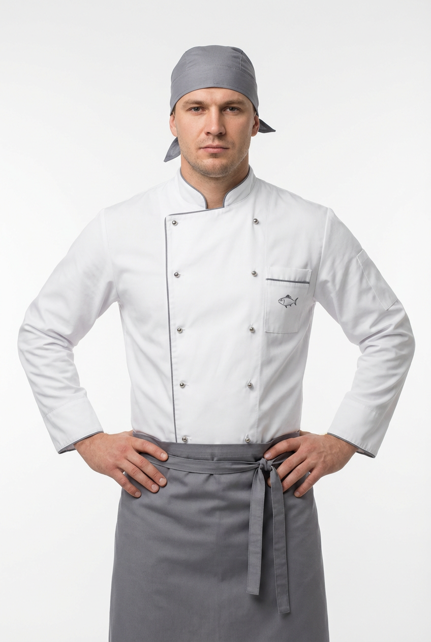Белый мужской поварской китель с серой декоративной полосой и вышивкой рыбы на нагрудном кармане. Двубортный крой с серыми пуговицами, серый фартук и бандана в комплекте. Отличный выбор для поваров рыбных ресторанов.